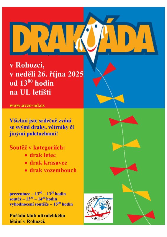 Osmnáctý ročník drakiády v Rohozci se bude konat v neděli 26. října tohoto roku od 13 hodin na UL letišti.Osmnáctý ročník drakiády v Rohozci se bude konat v neděli 26. října tohoto roku. Srdečně jsou zváni všichni, kdo si rádi hrají - věkový limit pro soutěžící je stanoven v rozmezí 1-100 let.